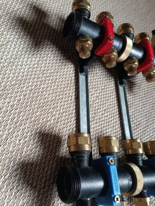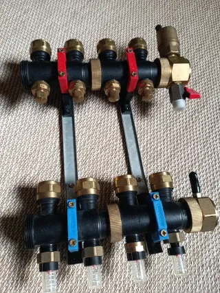 Colector para suelo radiante con 4 salidas de 20 mm. Incluye accesorios de montaje. - Material: Latón y plástico. - Color: Negro y dorado. Le falta los tapones solamente