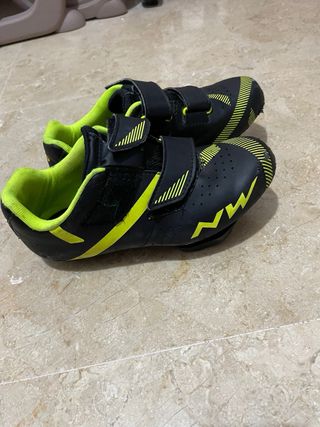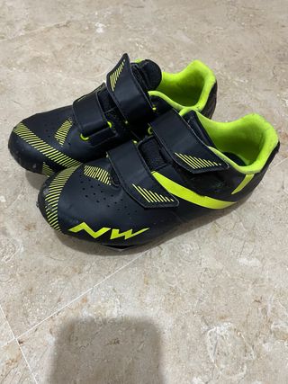 Zapatillas de ciclismo de la marca NW. - Color negro con detalles en neón. - Cierre con velcro. - Diseño deportivo.