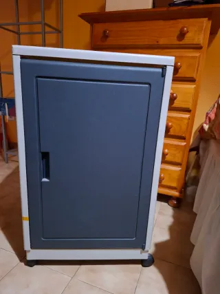 Armario organizador con un diseño moderno y funcional. - Estructura de plástico resistente. - Puerta frontal con tirador. - Ruedas para fácil movilidad.