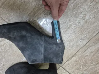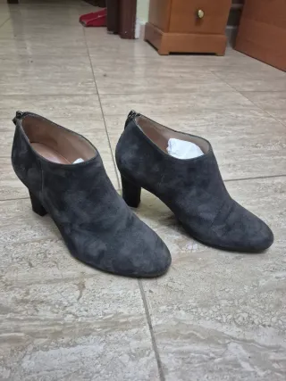 Botines de ante grises con tacón. Un modelo elegante y versátil. - Tacón de bloque. - Cierre de cremallera en la parte trasera. - Diseño de corte tobillero.
