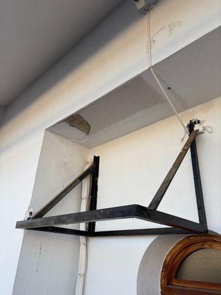 Soporte de metal con diseño triangular. - Estructura robusta de color negro. - Ideal para colgar objetos o como base.