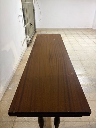 Mesa de madera con un diseño clásico, ideal para proyectos de restauración. Su estructura robusta ofrece una base sólida para renovar. - Tablero de madera con veta marcada. - Patas torneadas con base decorativa.