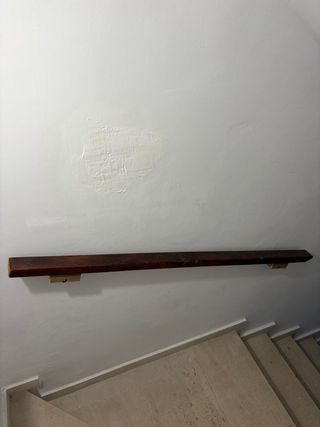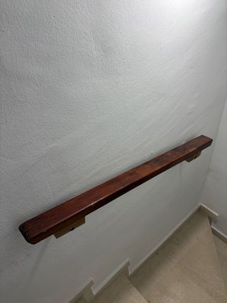 Pasamanos de madera oscura para escaleras. Ideal para añadir un toque rústico y funcional a tu hogar. - Material: Madera. - Color: Marrón oscuro.