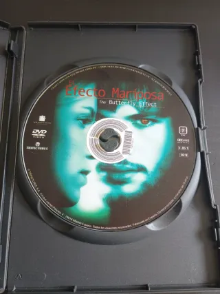 Película El Efecto Mariposa en formato DVD. - Protagonizada por Ashton Kutcher y Amy Smart. - Incluye la frase El simple aleteo de una mariposa puede desencadenar un huracán en el otro extremo del mundo. - Distribuida por Tripictures.