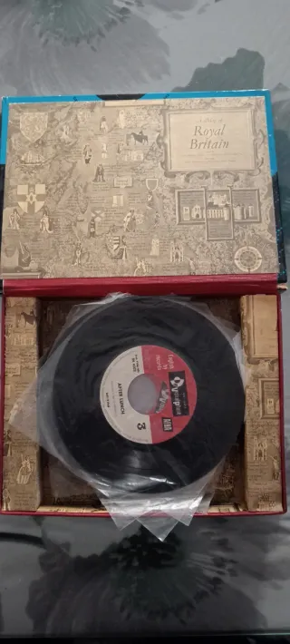 Estuche de vinilos para aprender inglés, con temática de la historia real británica. - Incluye 12 discos de vinilo. - Diseño del estuche con mapas y figuras históricas.