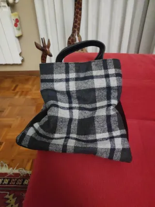 Elegante bolso de mano con un diseño de cuadros clásico. - Asa de cuero. - Tejido de cuadros en tonos grises y negros.