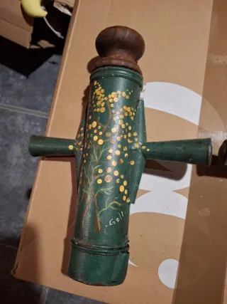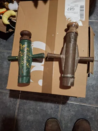 Dos churerras antiguas, una de ellas decorada con motivos florales dorados sobre fondo verde. La otra churrera es de metal. Una mide 29cm y otra 25cm