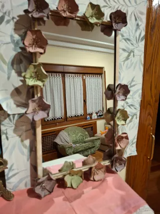 Precioso espejo con un marco adornado con flores. - 59x38cm - Flores decorativas en tonos marrones, verdes, malva y beis. - Le faltan los pistolas de una amapola, como se ve en fotos