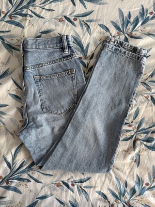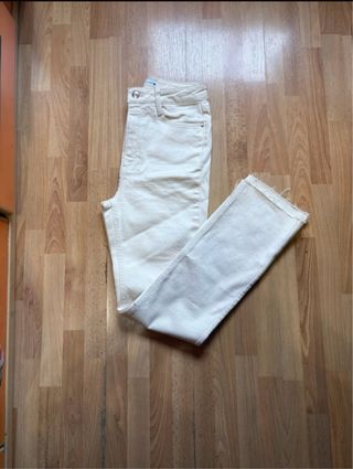 Pantalones vaqueros de Zara en color azul claro, de corte slim crop. Es un modelo sencillo y actual, con un lavado claro y tejido vaquero de grosor medio. Talla 36 (USA 29). Cinco bolsillos y cierre frontal de botones. La rotura de la pernera formaba parte del diseño original del pantalón. Usados. La rotura original se ha ido agrandando con el uso y los lavados, tal y como se aprecia en las fotos. Se pueden utilizar así o remendar o añadir un parche, a tener en cuenta. El resto del pantalón está en buen estado.