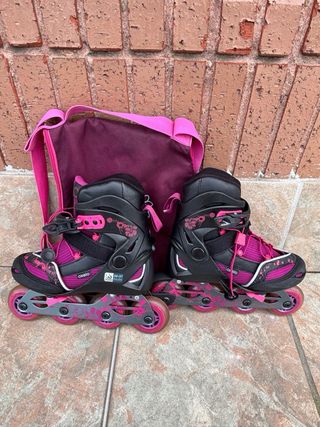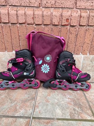 Set de patines en color negro y rosa, con un diseño floral. - Incluye funda a juego de color rosa. - Talla 34-37 En buen estado. Tienen algun rayonazo pero por lo demás estan muy bien.
