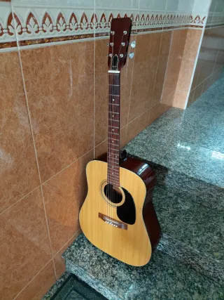 Guitarra acústica con un diseño clásico de los años 70. Su cuerpo de madera le da un sonido cálido y resonante. - Cuerpo de madera clara. - Mástil de madera oscura. - Clavijero metálico.