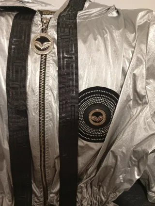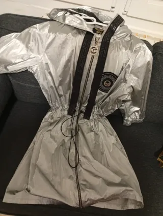 Chaqueta con capucha y detalles llamativos. - Diseño brillante y moderno. - Cierre de cremallera frontal. - Cintura ajustable con cordón. - Mangas cortas.