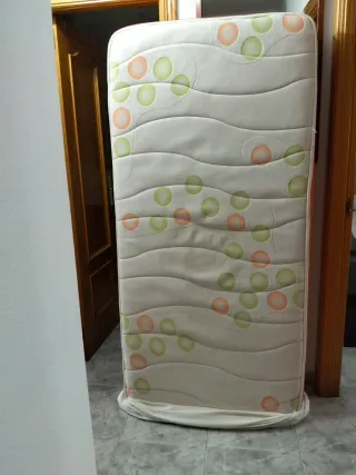 Se vende colchón y somier de 90cm. - Colchón con diseño de círculos en tonos verdes y naranjas. - Tejido exterior de tela.