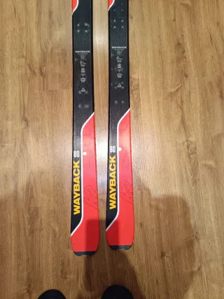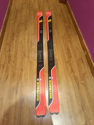 Esquís de montaña K2 Wayback 80. - Diseño en rojo y negro. - Marca K2. - Modelo Wayback 80. - 163 de largo - Una tabla fue taladrada mal por error. Tiene tapados y sellados esos taladros.