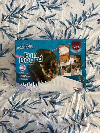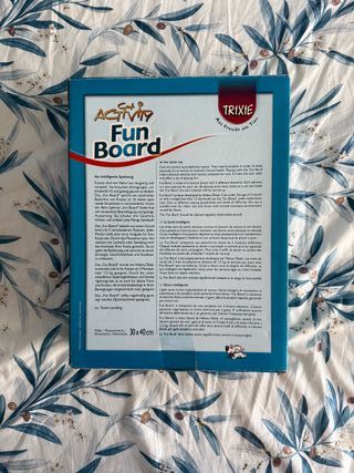Juego interactivo para gatos Trixie Fun Board, pensado para estimular la mente y mantenerlos entretenidos mediante distintos compartimentos y obstáculos. Incluye todas las piezas originales, con los módulos y los cuatro recipientes transparentes. Medidas aproximadas 30x40 cm. Fabricado en plástico resistente y fácil de limpiar, con instrucciones originales. Usado, en buen estado general y totalmente funcional. La caja original presenta desgaste visible.