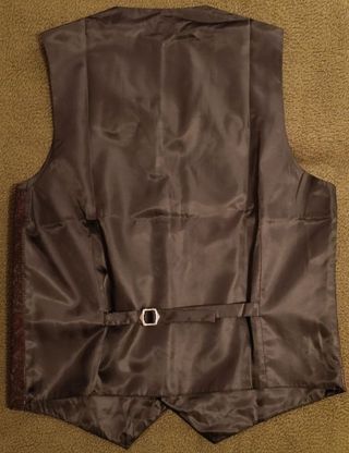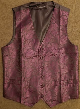 Chaleco elegante para traje de hombre en color púrpura con estampado Paisley. Talla M (adjunto tabla de tallas oficial). Marca Barry Wang. 80% seda y 20% poliester. Incluye botón de recambio. Sin usar. Solo probado ante el espejo. Me quedaba un poco grande y se me pasó el periodo para devolverlo, así que aquí lo tienes. - Diseño Paisley. - Botones frontales. - Bolsillos en la parte inferior.
