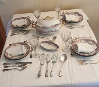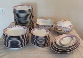 Vajilla Bidasoa vintage de porcelana con elegante cenefa floral en tonos lila y filo dorado. Conjunto completo ideal para mesa clásica, celebraciones o decoración. Incluye: - 24 platos llanos - 12 platos hondos - 11 platos de postre - 4 fuentes - 1 sopera con tapa - 1 ensaladera - 1 recipiente pequeño para aperitivos Vajilla de porcelana española de gran calidad. Estado general muy bueno. Algunas piezas presentan pequeñas muescas o marcas en el borde propias del uso y acordes a su antigüedad (ver fotos). Se vende completa. Entrega en mano.