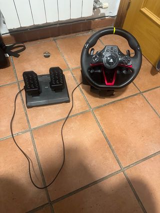 Volante de carreras inalámbrico con pedales. - Diseño deportivo en negro y rojo. - Volante con detalles en amarillo. - Incluye base de pedales.