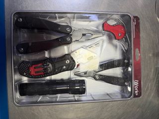 Práctico juego de herramientas iWork con varios elementos esenciales. - Alicates multiusos. - Linterna. - Navaja con mango negro y detalles rojos. - Pequeño cortador rojo.