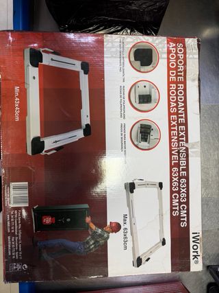 Juego de 3 soportes rodantes extensibles de la marca iWork. Son ideales para colocar ruedas de forma segura. - Capacidad máxima de 100 kg. - Extensibles hasta 60 cm. - Plegados miden 40 cm.