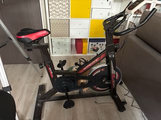 Bicicleta estática tipo spinbike, ideal para entrenamientos en casa. Diseñada para ofrecer una experiencia de ciclismo indoor. - Estructura robusta y estable. - Asiento ajustable. - Pedales con agarre. - Portabidón incluido.