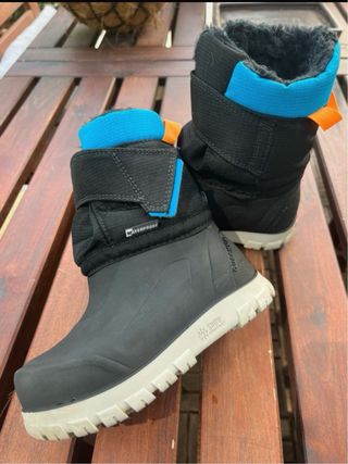 Botas de nieve Quechua para niño/a, usadas solo dos de veces. Talla 26. Precio en tienda original mas de 30€ - Color negro y azul. - Cierre de velcro. - Forro interior muy cálido. - Suela de goma antideslizante.