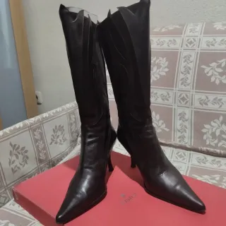 Elegantes botas altas de piel para mujer. - Material exterior: Piel. - Color: Marrón oscuro. - Diseño de caña alta. - Tacón fino.