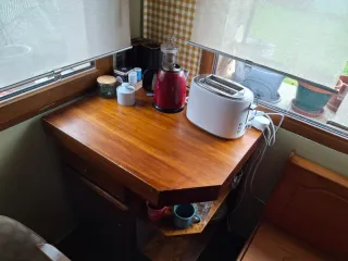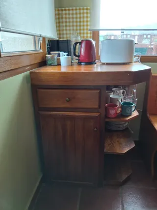 Mueble rinconera de madera, ideal para desayunos o como vajillero. - Diseño de esquina. - Cajón superior con tirador. - Puerta inferior con bisagras.