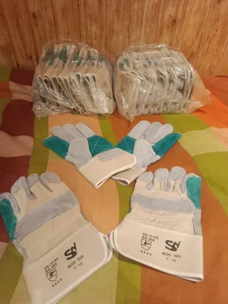 Lote de 24 pares de guantes de cuero y lona, ideales para trabajos que requieren protección. Se venden por lotes de 12 pares de guantes. - Talla T-10. - Certificación CE/0162 EN 388. - Diseño en beige y verde.