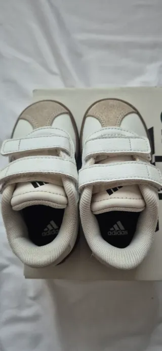 Zapatillas deportivas para bebé de la marca Adidas. - Cierre de velcro. - Color blanco y negro - Logo de Adidas en la plantilla y en la lengüeta. Talla 21 Casi nuevas con poco uso