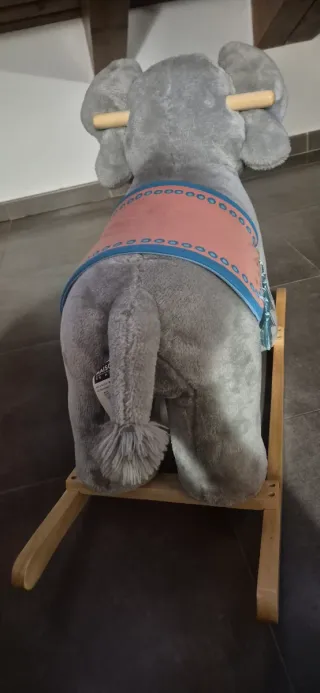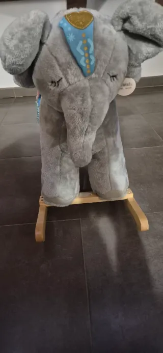 Elefante de peluche para balancearse, ideal para los más pequeños. Suave al tacto y con un diseño encantador. - Peluche gris de elefante. - Base de madera para balanceo. - Adorno azul y dorado en la cabeza.