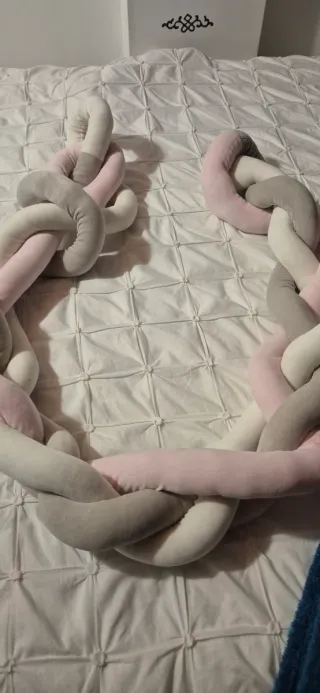 Cojín trenzado de varios colores para cuna. - Colores: blanco, gris y rosa. - Material suave y acolchado. - Diseño de trenza gruesa. - Mide 1.50 metros ya trenzado