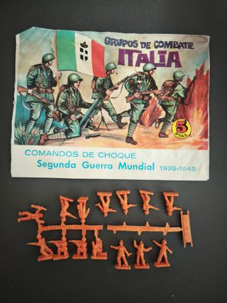 Lote de figuras de plástico de Montaplex, temática Comandos de Choque Italia Segunda Guerra Mundial. - Incluye sobre con ilustración. - Colada de figuras de soldados italianos. - Figuras sueltas para coleccionismo.