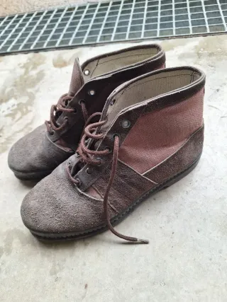 Botas Chirucas antiguas en color marrón. - Fabricadas en ante y lona. - Cierre de cordones.
