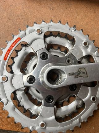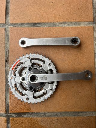 Conjunto de bielas Shimano Alivio de aluminio. - Bielas de aluminio plateadas. - Incluye plato y biela. Están sucias pero en perfecto estado de uso.