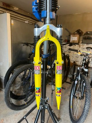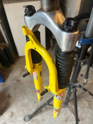 Horquilla de Suspensión RockShox Quadra 21R ROTA. Los elastomeros estaban deshechos dentro, esta hecho mierda por dentro. No digo que no se pueda limpiar todo y poner nuevos los elastomeros, pero a li no me merece la pena y por eso tiene este precio. Para adorno o recambios esta bien. Ver fotos. Los tapones están bien y funcionan ademas creo que valen para ptroa modelos como judy, indy, jett (comprobar), no parece que haya ningun oxido en las barras, los fuelles, botellas, puente y pletina están bien. El tubo de direccion mide 19cm y es de 1, 1/8 de diametro. Lleva araña puesta. Las botellas están algo arañadas.