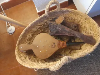 Conjunto de salvachispas y utensilios para chimenea. - Salvachispas 71x55x20 - Juego con atizador, pala, pinzas, escobilla y fuelle. - Cesta de mimbre para leña y cubo para ceniza