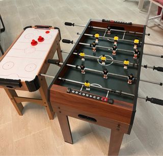 Conjunto de mesa de juegos que incluye futbolín y air hockey. Ideal para entretenimiento en casa. - Diseño de madera. - Figuras de futbolín. - Pucks y mazos de air hockey incluidos.