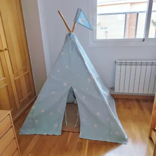 Divertido tipi / teepee para que los más pequeños jueguen y se diviertan. Ideal para habitaciones infantiles o de atrezzo para fotos. - Diseño con estrellas en color azul claro. - Incluye banderín decorativo. - Muy buen estado. - Medidas en la última foto. - Al terminar se puede plegar y no ocupa espacio.