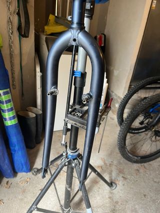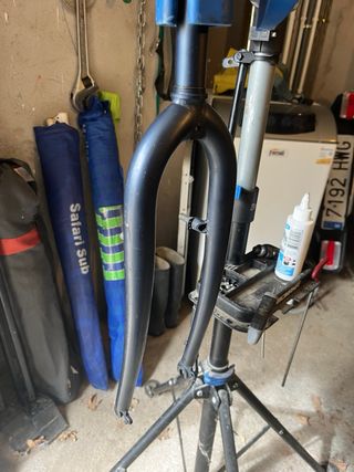 Horquilla rígida Scott para bicicleta. - Diámetro de tubo de dirección: 1 pulgada. - Dirección de rosca - Longitud tubo 19cm. - Longitud de rosca 3cm. - Para ruedas de 26” Color azul grisaceo. Pertenecía a una Scott Blackstone. Esta troquelada con scott en la puntera. Probablemente sea de cromo como el cuadro. Ideal para restaurar clásica o montar una gravel. Y juego de dirección de rosca.