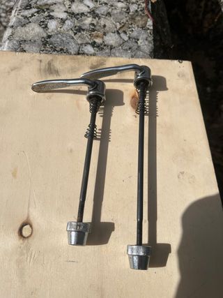 Set de cierres rápidos Shimano clásicos para bicicleta. - Cierres de liberación rápida. - Eje de acero con acabado plateado. - Resortes de compresión.
