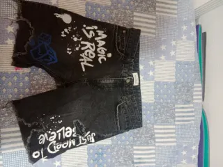 Pantalones vaqueros cortos con un diseño único de graffiti. - Estilo desgastado y con rotos. - Estampado Magic is Real en blanco. - Dibujos de dados y salpicaduras. - Detalle de texto Just Need To Believe en el bajo.