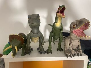 Conjunto de figuras de dinosaurios de juguete. - Figura de Triceratops. - Figura de Velociraptor. - Figura de Tiranosaurio Rex. - Figura de Indominus Rex. Dinosaurios originales de matel con huella para la aplicacion 10€ cada uno Pack 30€