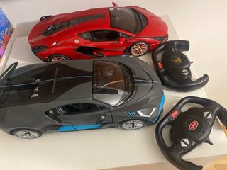 Dos coches teledirigidos con mandos. - Coche deportivo rojo. - Coche deportivo negro y azul. - Mando con logo de Lamborghini. - Mando con logo de Bugatti. Cada coche 30€ 50€ los 2