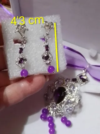 Conjunto de aderezo huertana para niña. - Diseño con detalles en forma de corazón. - Incluye pendientes y colgante. - Adornos en forma de lágrima morada.