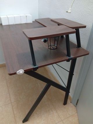 Escritorio con superficie de madera y estructura metálica. - Diseño moderno con baldas superiores. - Patas plegables para fácil almacenamiento.