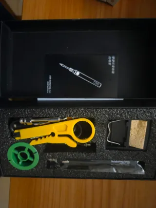 Kit de soldadura portátil con alimentación USB. Incluye varios accesorios para tus proyectos. - Soldador USB - Soporte para soldador - Esponja limpiadora - Carrete de estaño - Herramienta de corte y pelado