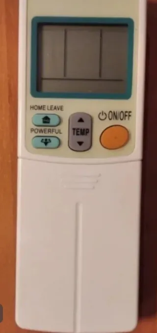 Mando a distancia para aire acondicionado Daikin. - Botones de control de temperatura. - Función ON/OFF. - Botones Home/Leave y Powerful. - Utiliza 2 pilas AAA