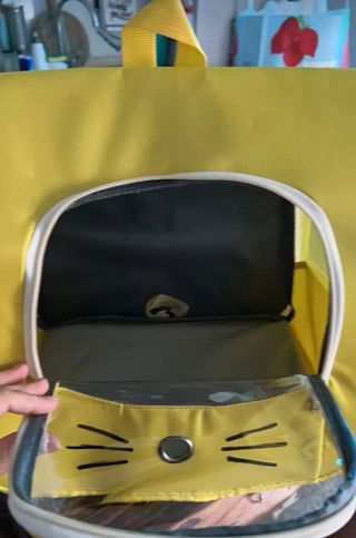 Mochila portátil para mascotas con un diseño divertido. - Material resistente. - Ventana transparente para ver al animal. - Asa superior para facilitar el transporte.