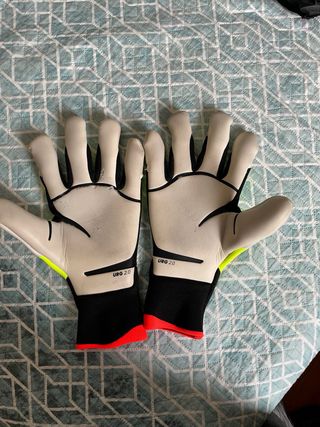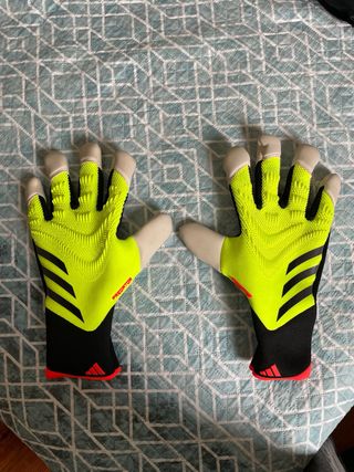 Guantes de portero Adidas Predator en color amarillo y negro. - Diseño con detalles en negro y rojo. - Logo de Adidas en la muñeca. Usado en un partido